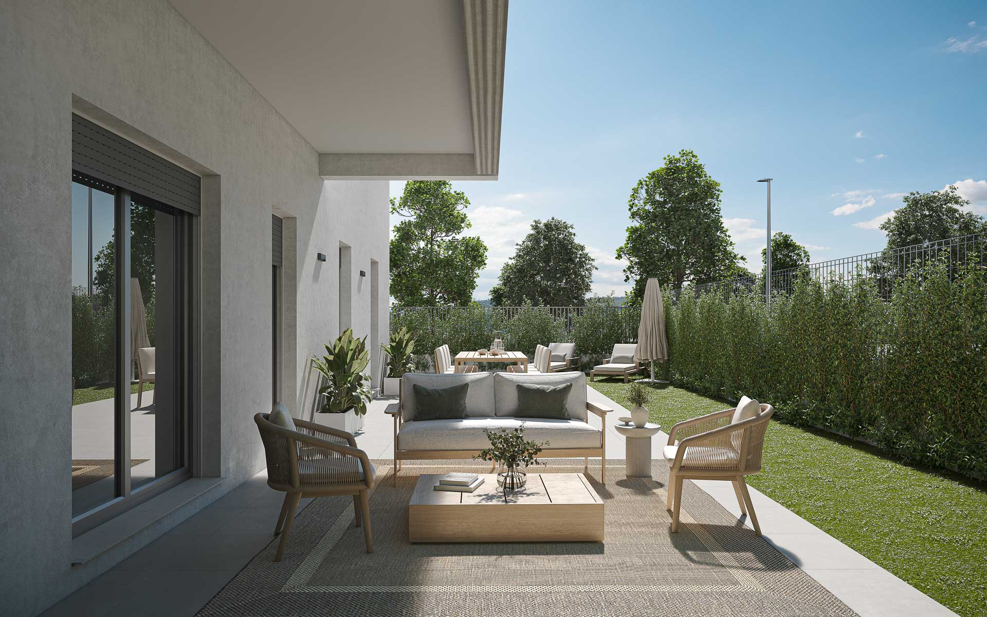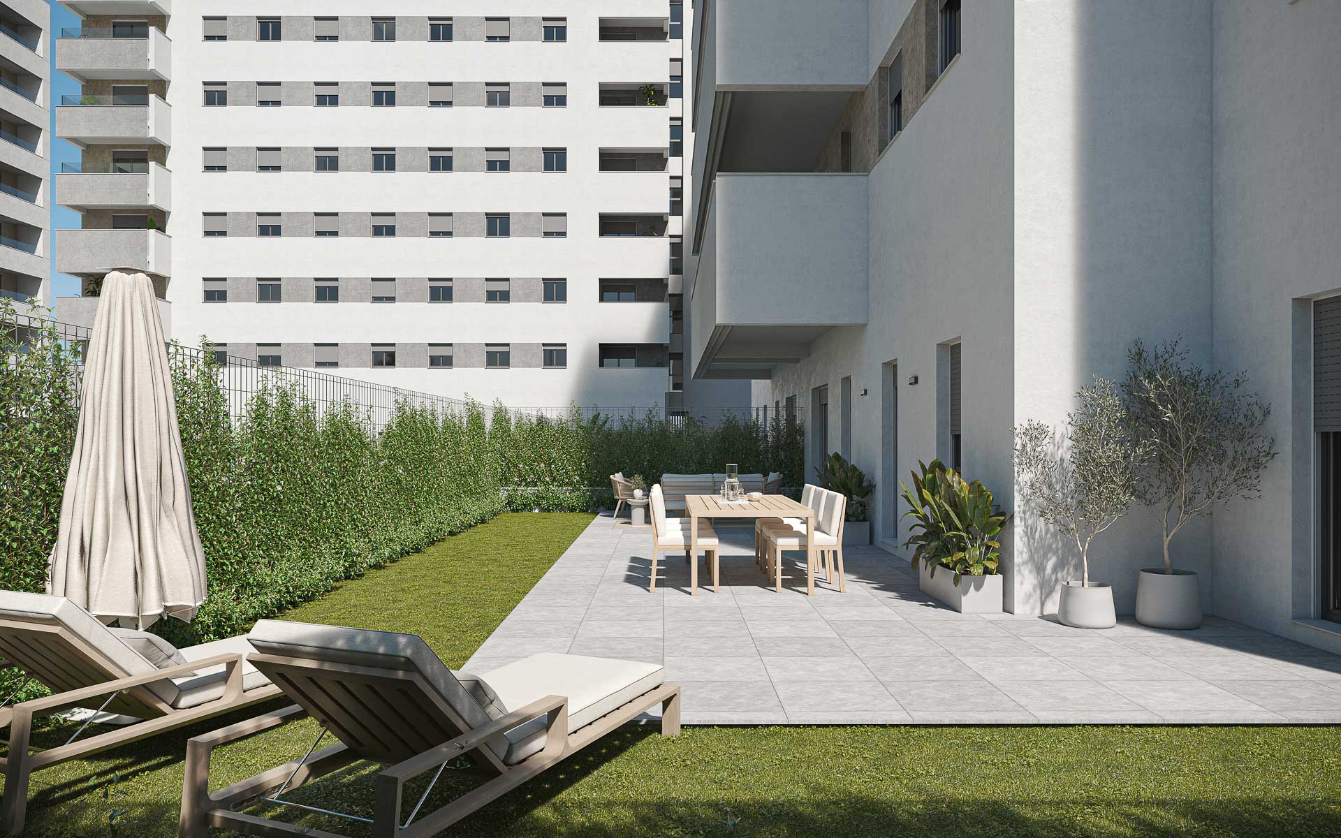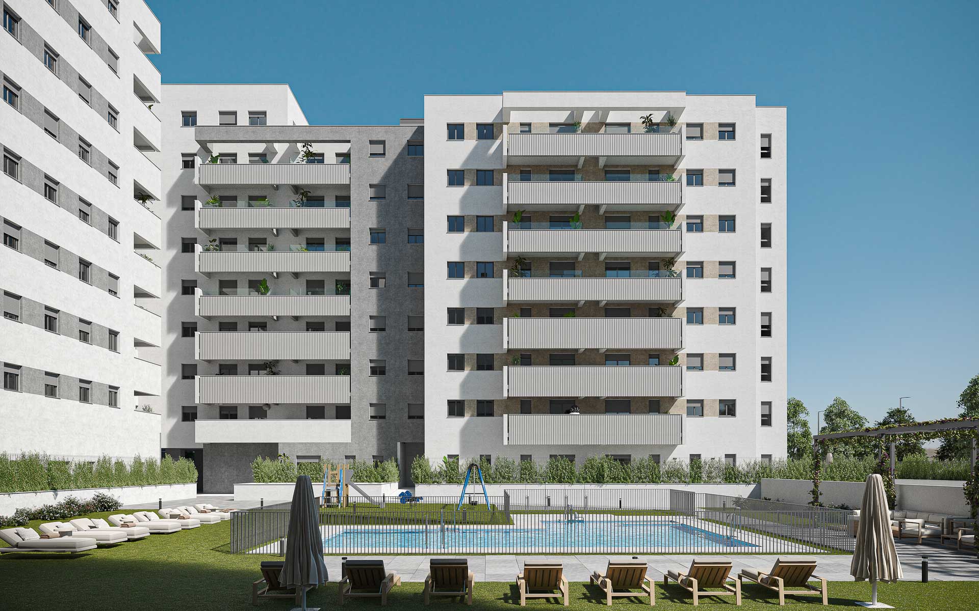 La planta baja incorpora un soportal público que da paso a las zonas comunes, donde se ubican la piscina, zonas verdes y espacios de estancia, diseñados como extensión natural de las viviendas. Las tipologías incluyen unidades de 2, 3 y 4 dormitorios, con distribuciones que priorizan la funcionalidad y la claridad espacial. Bajo rasante, el conjunto cuenta con dos niveles de sótano que albergan plazas de aparcamiento, trasteros y cuartos técnicos, con una dotación ajustada a normativa y soluciones específicas para vehículos grandes y plazas adaptadas.