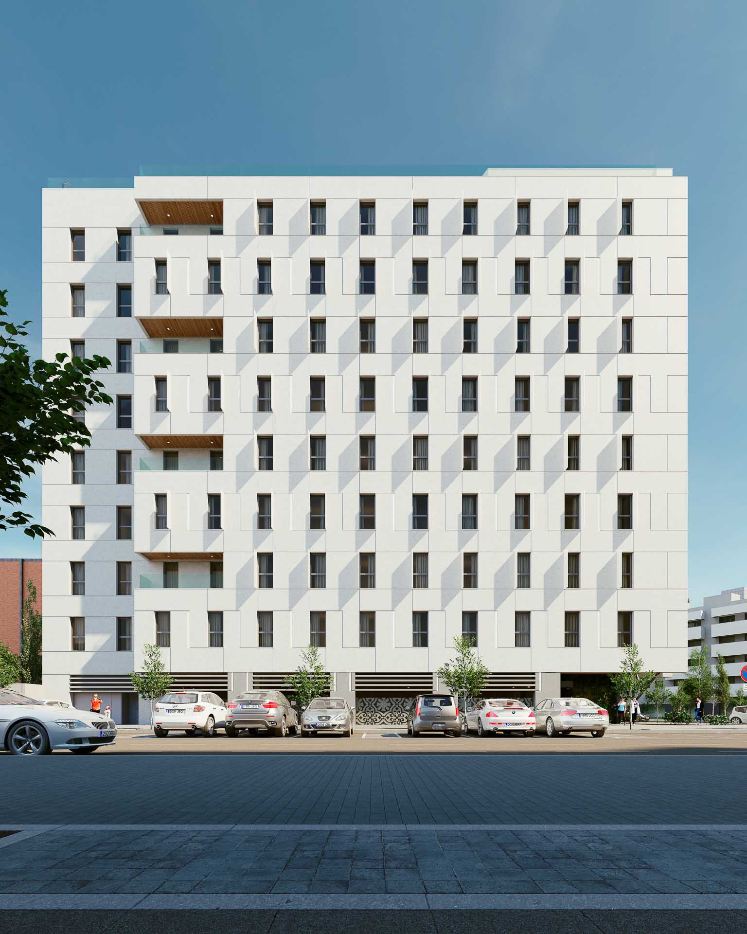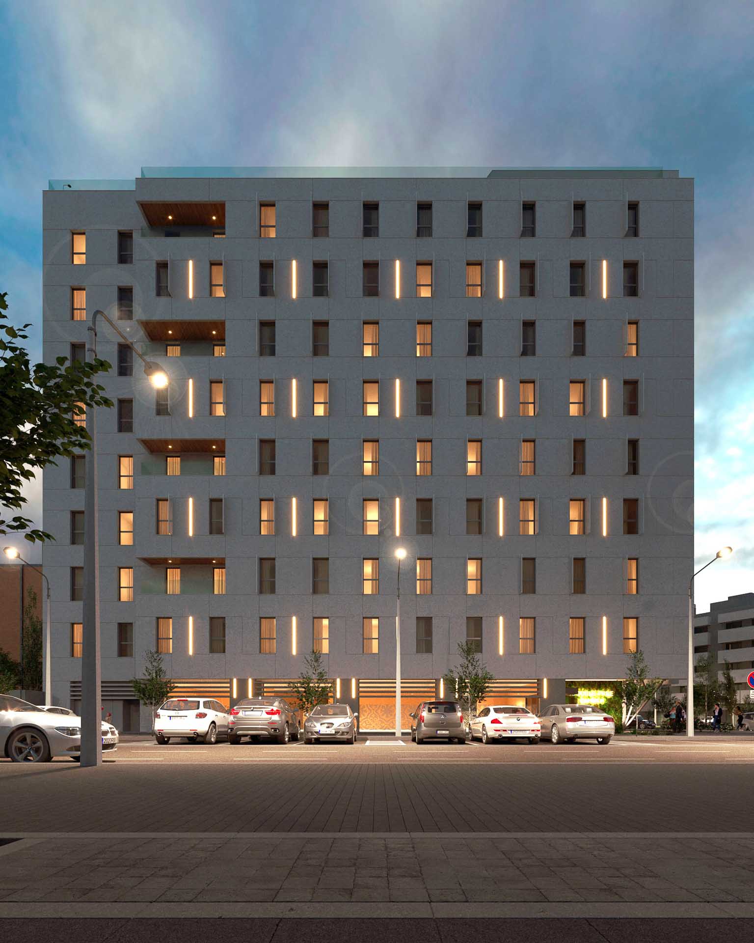 Este proyecto desarrolla un hotel de 4 estrellas en un enclave urbano estratégico, en una parcela en esquina que permite una implantación con doble fachada diferenciada y un patio interior estructurador. El edificio se organiza en torno a un núcleo central de comunicaciones y dos escaleras laterales, con acceso principal en ménsula que refuerza la singularidad del volumen. El patio interior, además de aportar luz y ventilación natural, actúa como filtro visual y ambiental, ocultando elementos técnicos del entorno y generando una conexión visual con la ciudad desde las zonas comunes superiores.