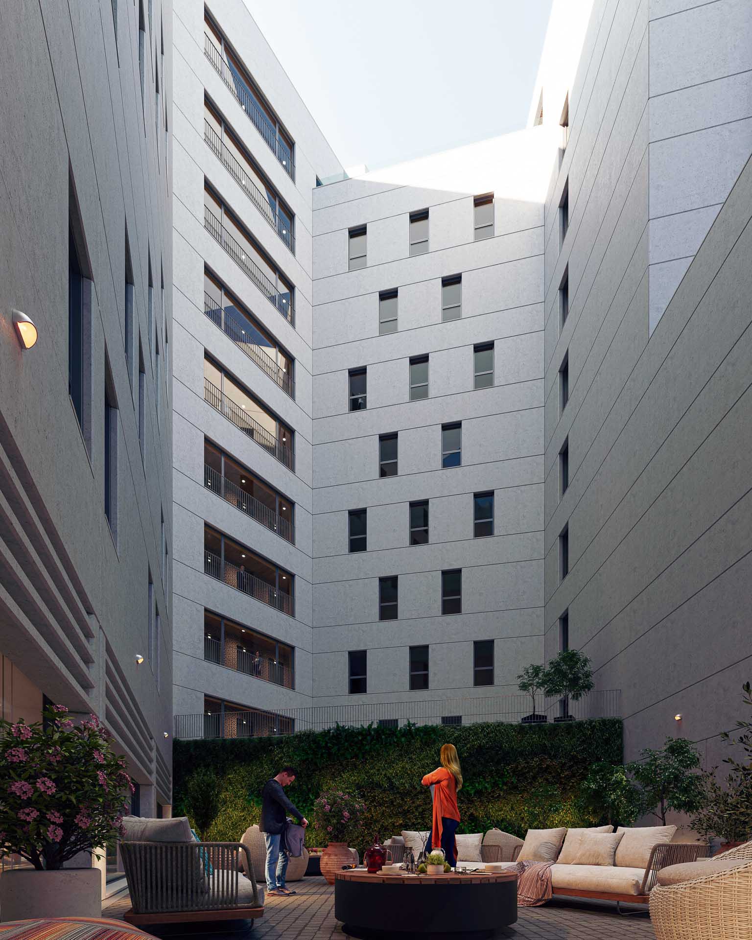El diseño incorpora soluciones técnicas avanzadas para optimizar el confort acústico, la eficiencia energética y la sostenibilidad del edificio. Se prevé un sistema de recuperación de aguas grises, aislamiento acústico reforzado en cerramientos y particiones, y control inteligente de iluminación y climatización. La envolvente ha sido diseñada para reducir la demanda energética y mejorar el comportamiento higrotérmico, garantizando una experiencia de usuario de alto nivel en un entorno urbano exigente.