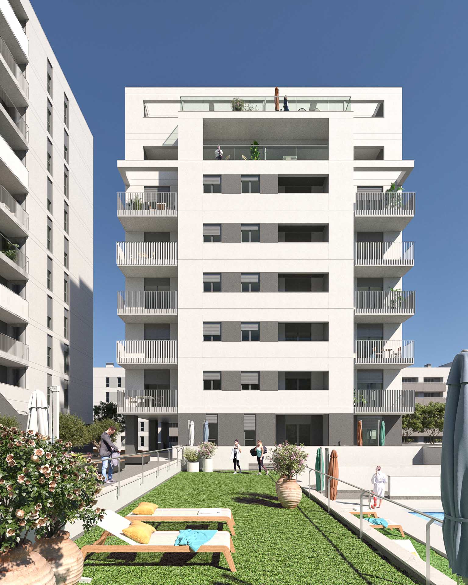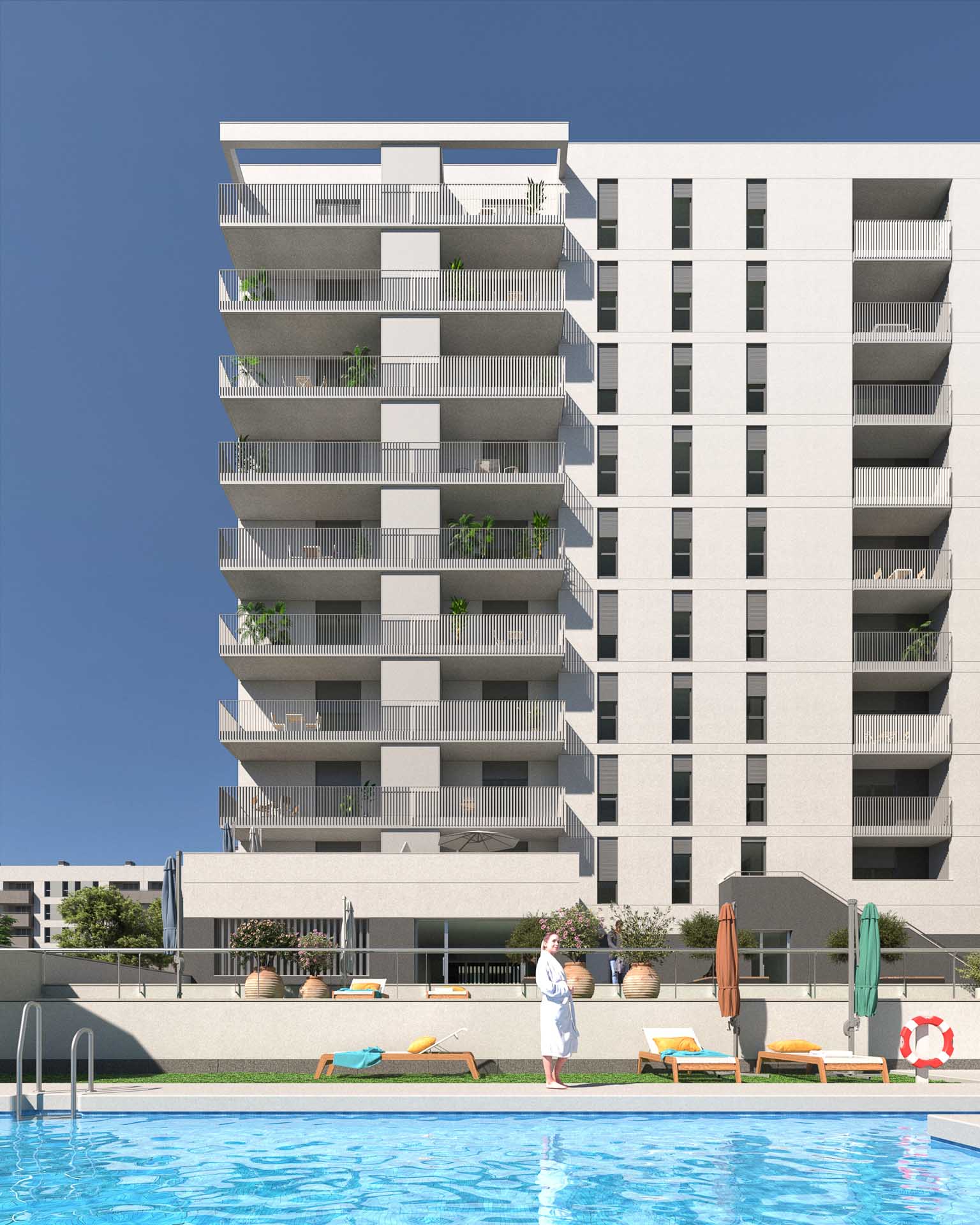 La promoción se estructura en torno a espacios exteriores ajardinados y una piscina comunitaria, situada sobre la cubierta de los locales. Esta zona de estancia general se conecta directamente con el interior del conjunto, favoreciendo la relación entre vivienda y espacio libre. Las tipologías se adaptan a distintos perfiles residenciales, con apartamentos compactos y viviendas familiares, todas ellas con distribución abierta en salón-comedor-cocina. El diseño busca minimizar recorridos verticales y diferenciar claramente los usos, garantizando una experiencia residencial cómoda y eficiente.